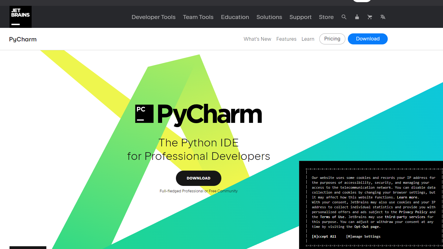 - PyCharm : JetBrains에서 개발한 파이썬 전용 IDE로, 커뮤니티 에디션은 무료로 사용할 수 있습니다. (https://www.jetbrains.com/pycharm/)